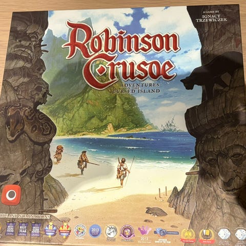 Robinson Crusoe Collector's Edition brettspill. Spillet er designet for å gi en opplevelse basert på Robinson Crusoe-temaet. Inneholder komponenter tilpasset brettspillformat.