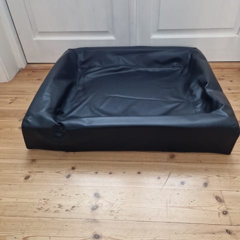 Hundeseng med avtagbar pute i blått stoff med rutete mønster. Sengen har glidelås for enkel rengjøring og pute kan tas ut. Egnet for små til mellomstore hunder.