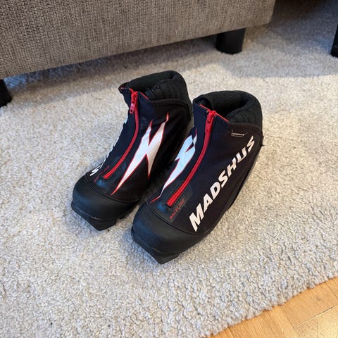 Madshus Race Line langrennsko med svart og hvit farge. Skiene har en slitesterk konstruksjon med feste og såle tilpasset langrenn. Str 33. Nesten ikke brukt!