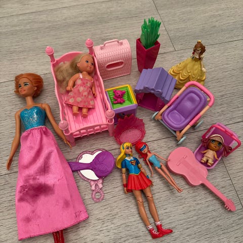 Barbie lekesett som inkluderer ulike tilbehør som en liten hund, kjøkkenutstyr, klær, og diverse småting.Passer for barn som liker Barbie og samling av små leker. Barna i huset selger😊 100 kr for alt, ta kontakt du bare ønsker deler.