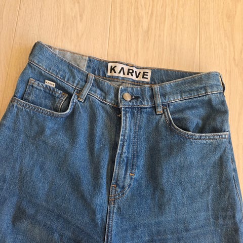 Selger ett par med jeans fra Karve str M, i fargen black stone (sort/mørk grå). Buksen er brukt ca 2 ganger, kjøpt på Carlings. 60% økologisk bomull. Ny pris: 699kr.