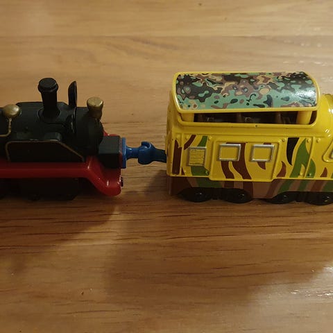 Togsett laget i tre med flere farger. Togsettet består av flere vogner med ulike former og farger, inkludert et lokomotiv og tilhørende vogner. Passer for barn og kan brukes til lek og læring. 200 for alt.