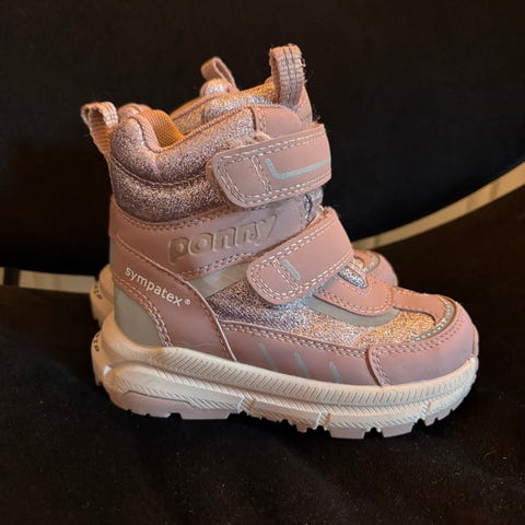 Skoene er brukt av et barn i ca 2 mnd før de ble for små. Noe missfarging på den hvite gummien etter lek i sandkasse, ellers er det så godt som ingen bruksmerker på skoene. Gode og varme sko. Holdt barnet god og varm på beina i -15 grader.