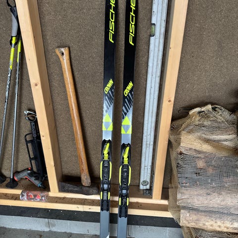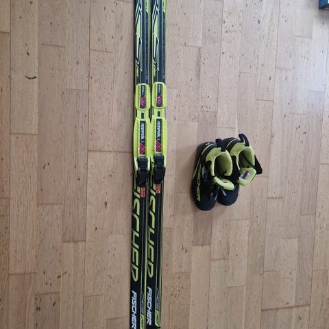 Fischer twinskin langrennsski med feller str 127 med Rottefella bindinger. Fischer sprint staver i str 95 cm. Selges samlet.
