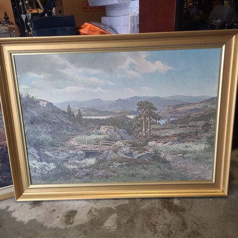 Hvile ved Bekken maleri med naturmotiv som viser en skog med trær, steiner og vann. 58cm x 78cm. Bildet har en ramme i gullfarge og en navneplate med tittelen på maleriet. Originalen er malt av Hans Gude. Hentes.