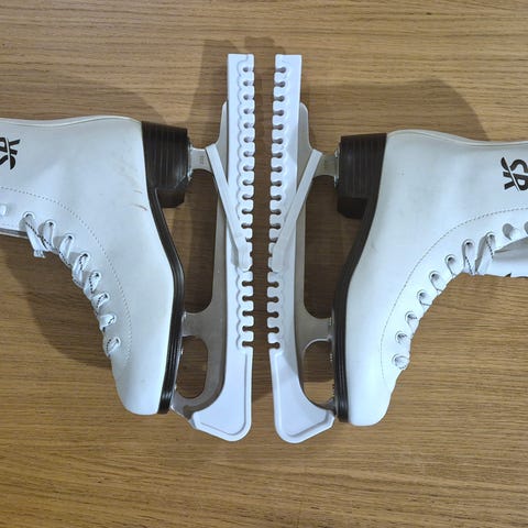 Designet i tradisjonell hvit stil med kunstløpklinge – perfekt for både nybegynnere og litt øvede som vil gå tur eller trene grunnleggende kunstløp.