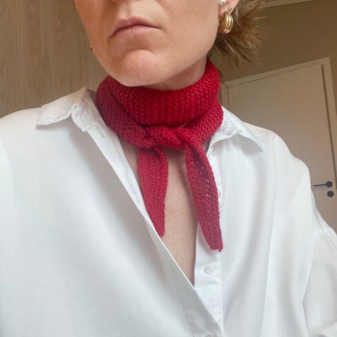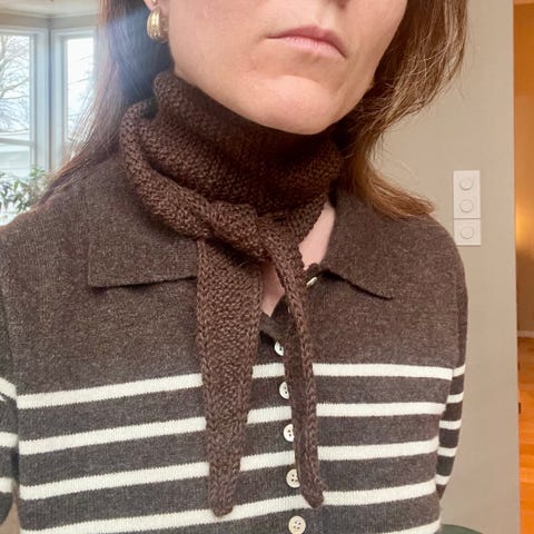 Lite hjemmestrikket Sophie scarf. Strikket av oppskriften til petite knit. Skjerfet når en gang rundt halsen slik bildene viser.