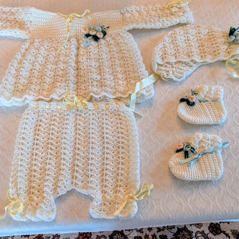 Heklet/strikket sett til nyfødt baby. Hvitt. Ubrukt. Har lagt på tommestokk på noen av bildene, så ser man ca størrelsen.