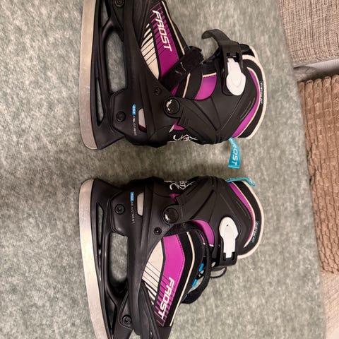 Graf Ishockey Skøyter for barn. Skøytene er designet for ishockey og har en kombinasjon av svart, hvit og blå farger. Skøytene kan justeres fra str 35-38.