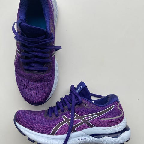 Asics Nimbus joggesko i størrelse 41,5, (26cm) Lilla med rosa og turkise detaljer.