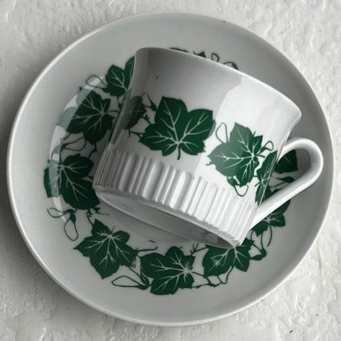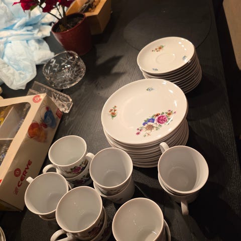 Selger komplett sett med 3 kaffekopper og 3 asjetter (14 cm dia.) fra Kahla, Øst-Tyskland (GDR-merke med krone).