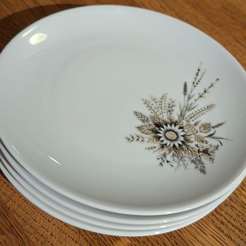 Dekor med brun solblomst, blader og grener på hvit base – klassisk retro porselen.