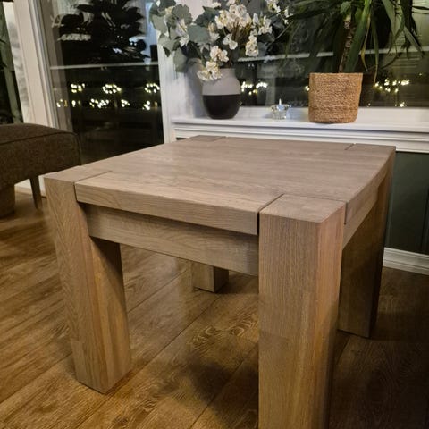 Fint bord med hylle under og 2 klaffer som kan tas av eller bytte side . Med klaffer er bordet 108cm × 91 cm Bordet er tungt og stabilt. Det er litt bruksmerker som ikke er veldig synlig.