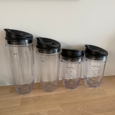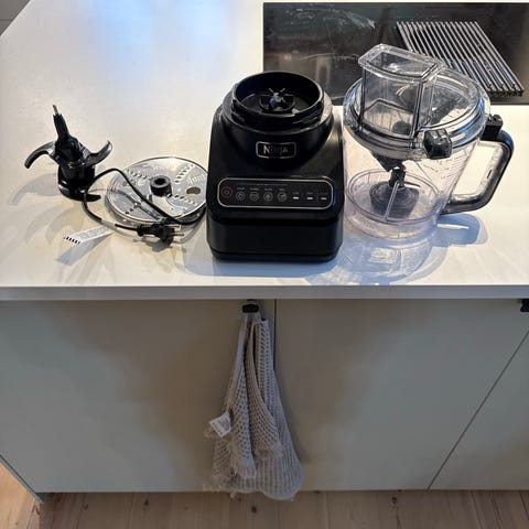 Ninja 2 in1 blender med to beholdere, inkludert en stor beholder for miksing og en mindre beholder for bærbar bruk. Blenderen har en svart farge og er laget for effektiv miksing av frukt og andre ingredienser.