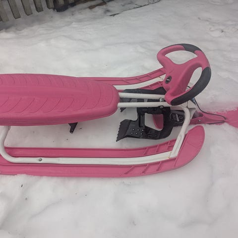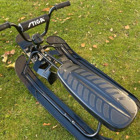 Stiga Snowracer barn akebrett med svart sete og ratt, gul og svart ramme. Designet for barn, egnet for bruk i snø.