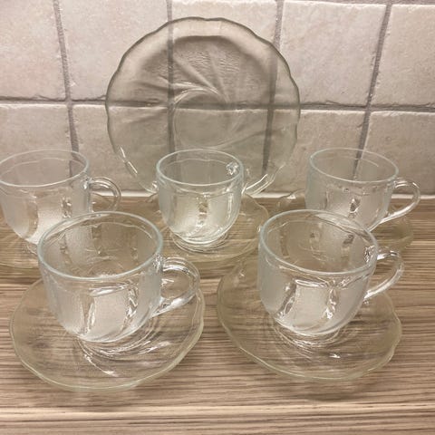 Pent brukte, retro glasskopper fra Arcoroc France (modell "Fleur") selges for kr 100.- for alle seks.