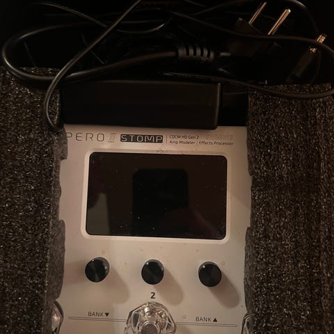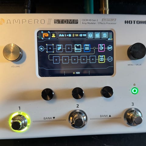 Hotone RAVO gitarutstyr med innebygde kontroller, loop, trommemaskin og expression pedal. Designet for bruk med gitar, egnet for justering av lyd og effekter under spilling.
