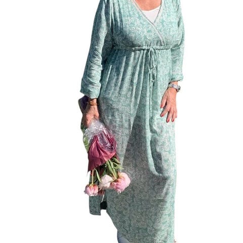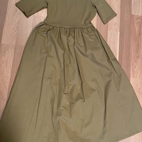 Ubrukt Sistersoul god og myk hverdagskjole i størrelse L, m/tag. 100% bomull. Foret. Den har snøring under byste. Grå farge med litt lett grønntone. Kjolen har lang lengde med detaljer i blonder på ermene og rundt halsen. Nypris kr 1.299,-. Pris er satt.