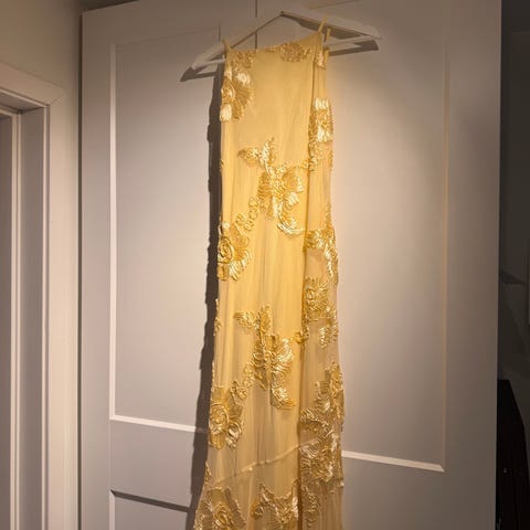 Pudderrosa maxikjole med gull/strasskjede og belte som kan brukes eller taes bort.