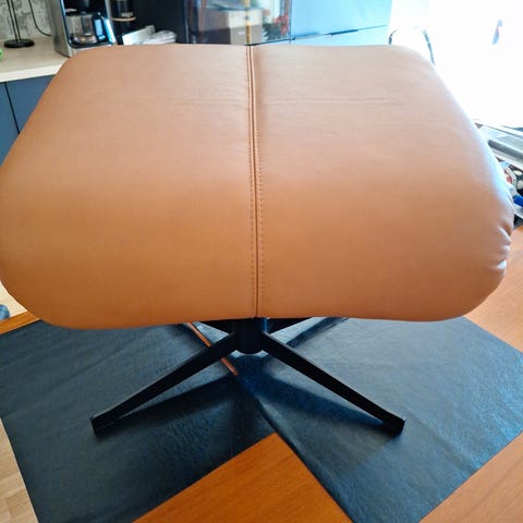 Polstrede overflaten i sort skinn gir møbelet karakter som bare blir vakrere med årene. De karakteristiske sømmene skaper en subtil struktur.