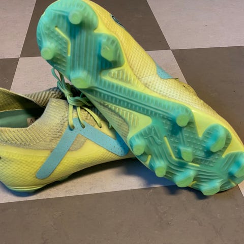 Puma future fotballsko i størrelse 41 med blå og grønn farge. Skoene er designet for bruk i fotball og har knotter under sålen for bedre grep på gressbaner. Litt små i str