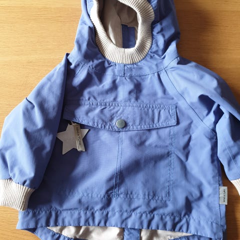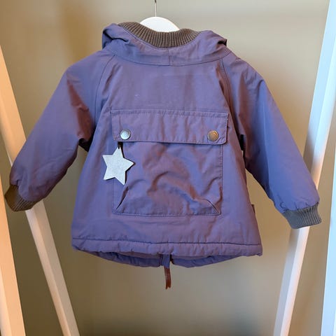 Lilla tykk jakke fra Miniature i str 80. Behagelig fleece innvendig. Denne har noen nupper- ikke synlig ved bruk. Jakken er vasket ihht anvisning. Praktiske hemper på armene til å feste votter.