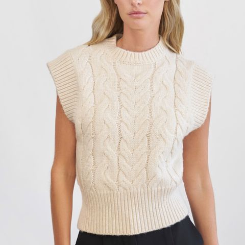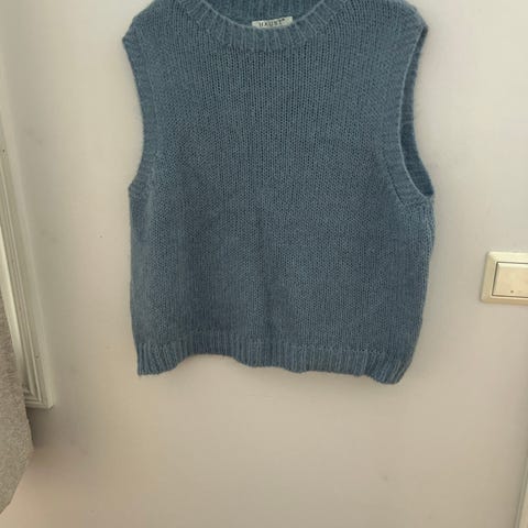 Donna strikket ull vest i melert blå, (lys blå)størrelse L. Vesten er en rett modell. Brystvidde 55 cm og lengde 60 cm. Strikket vest i fin blåfarge i ull og mohair. Klassisk. Ikke brukt.