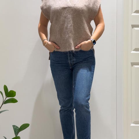 Donna strikket vest ull/mohair, melert blå, str L. Ikke brukt