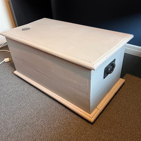 Fin kiste gis bort. Litt sprekt i lokket (se bilde), men fungerer fint ellers og det er god plass i den. Håndtak på begge sider og lukkemekanisme.