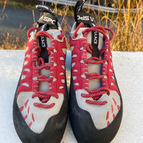 Mad Rock klatresko i størrelse 45, men er små i størrelsen så passer til 42-43. Kun brukt et par ganger. Passer til både klatring og buldring.