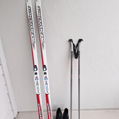 Madshus smørefrie langrennski 120 cm, Madshus skisko str 33 og Swix Frost skistaver 90 cm