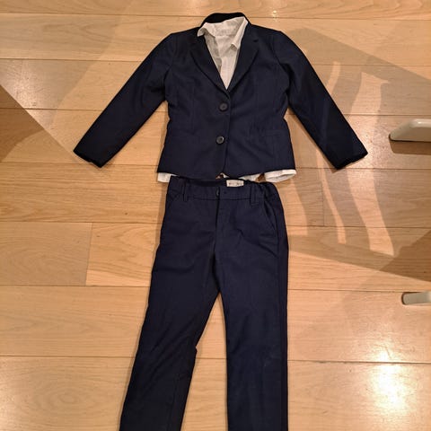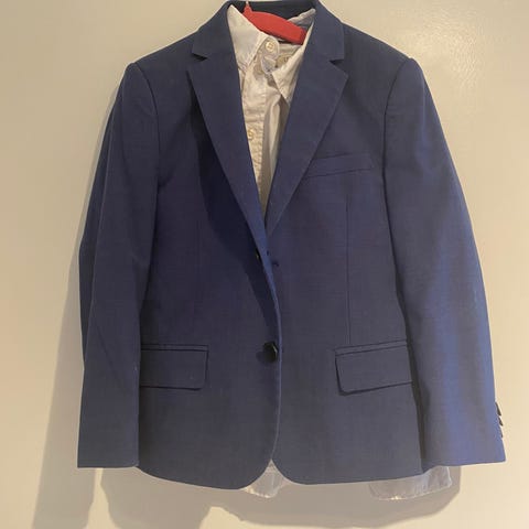 Skjorta og jakken er i størrelse 122, buksa er strl 128 men er brukt sammen av gutt på 5-6 år :)