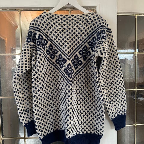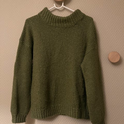 Vet ikke hvilket garn genseren er strikket i. Har en del nupper. Vil si den passer ca str M, men se bilder for mål.