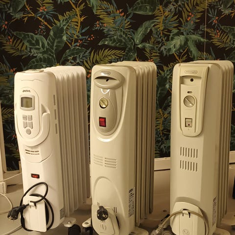 5 stk oljeovn med termostat og hjul for enkel flytting. Hvit farge, flere ribber for jevn varmefordeling. Strømledning og bryter for enkel kontroll av varmeinnstilling. Alle er velfungerende.