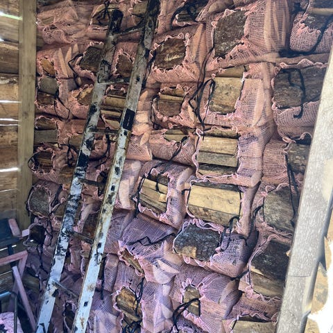 Selger 60 liters sekker med ved. Hugget vinteren 25. Lagret innendørs.