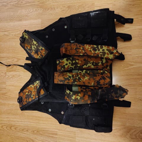 Genser, vest, bukse, håndleddbeskyttelse, pods med belte, og hansker til paintball selges. Kjøpt brukt, men ikke brukt av ny eier. Noe er strl L og noe XL, men alt er brukt samtidig av forrige eier. Åpen for bud ved rask handel