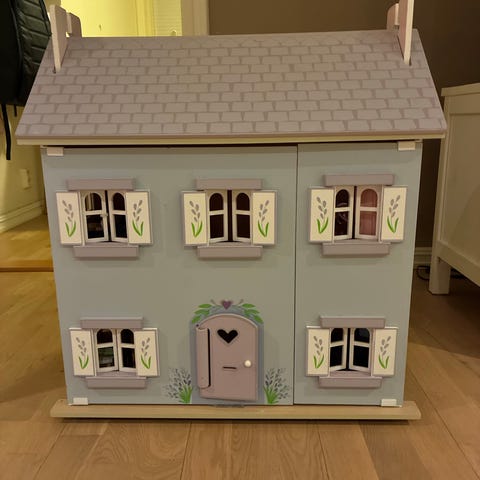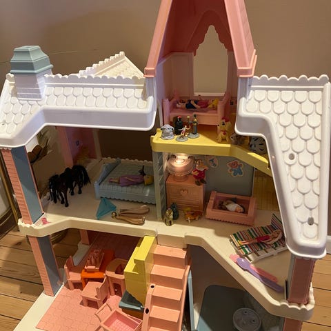 Ungen har rydda i lekene sine og kvitter seg denne gangen med en pose med masse lekemat . Alt er helt og pent og mye er lite brukt .