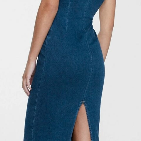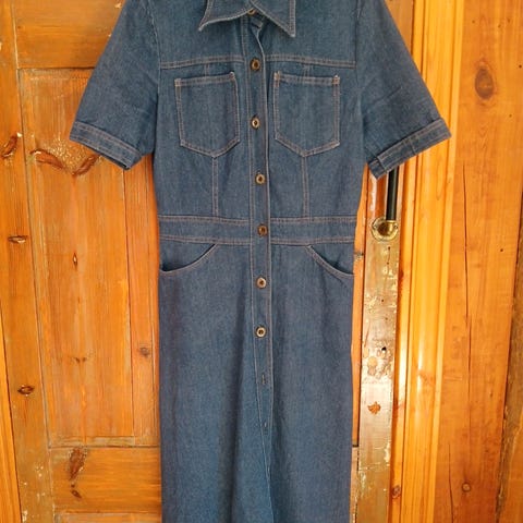 Pent brukt retro denim kjole i solid denim stoff, stretchy midje. Passer str S. Ta kontakt for nøyaktige mål.