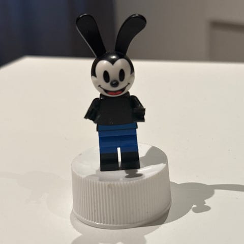 LEGO Disney Pinocchio minifigur med fargerik hatt, gul skjorte, blå sløyfe og røde bukser. Figuren er laget i plast og er en del av LEGO Disney-serien.