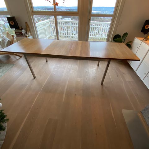 Selger dette spisebordet og 4 stoler i lys eik fra Skovly. Kjøpte det selv for noen måneder siden men det passer ikke inn i min stil, det ser helt nytt ut uten noen synlig bruksmerker. Det følger med 2 ilegges plater på 45 cm hver, så bordet kan være fra 160 cm til 255 cm. Stoler er også i lys eik med skinn trekk, disse var nylig trekt når jeg kjøpte det.