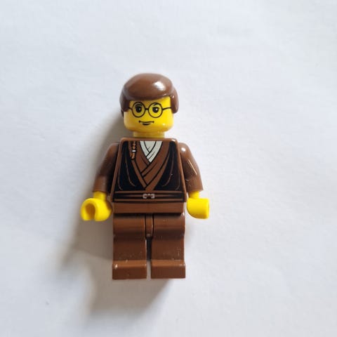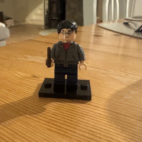 LEGO Harry Potter minifigur med svart kappe og hatt. Figuren har detaljerte klær i svart og rødt, og er en del av LEGO Harry Potter-serien.
