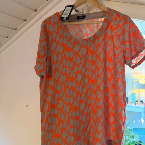 Flott topp fra Anne Sofie i varme toner av gult, oransje og brunt. Lett og luftig kvalitet med kort erm og rund hals. Behagelig passform som passer fint både til hverdags og litt penere bruk.