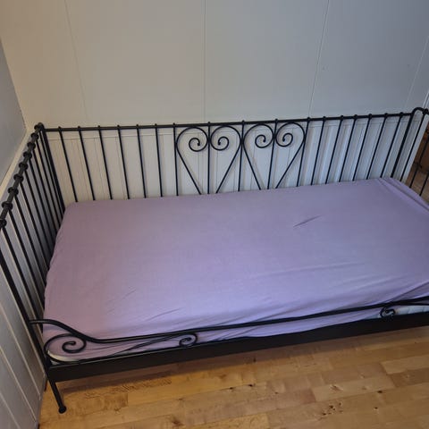 Eldre modell i heltre. Senga er i god stand. Madrassen er gammel, overmadrass to år og lite brukt. Kan ta med bare senga.