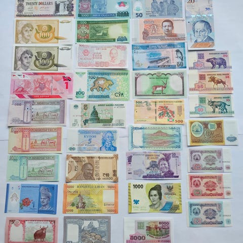 Selger 55 ubrukte sedler fra mange land, se bilder. Pluss porto.