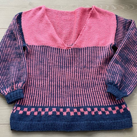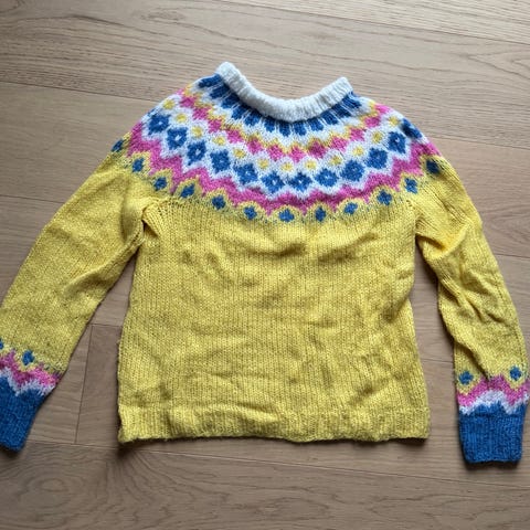 Kjenner ikke til hvilket garn genseren er strikket i, men ligner litt på air/kos.