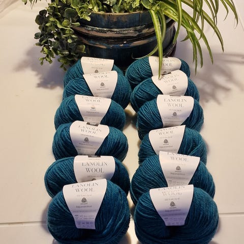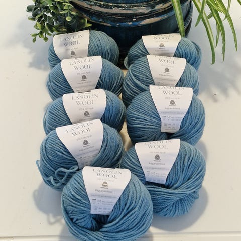5 nøster Dale Garn Natural Lanolin Wool garn i blå farge. Hver nøste veier 50 gram og har en lengde på ca. 100 meter. Garnet består av naturlig ull med lanolin og har en strikkefasthet på 22 masker per 10 cm. Anbefalt pinnestørrelse er 4 mm. Vaskes med skånsom behandling ved 30 grader..
