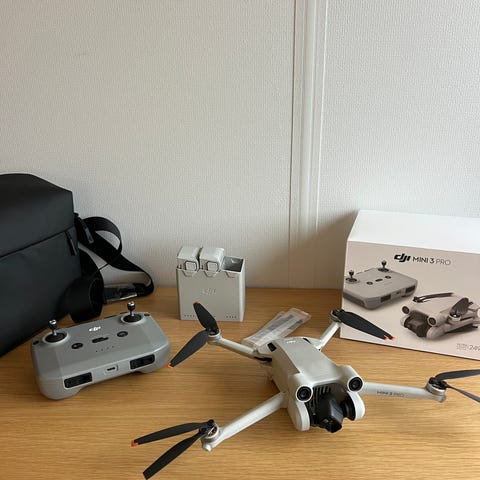 DJI Mini 4K selges med fjernkontroll og bæreveske. Dronen er kompakt og lett, med foldbare armer for enkel transport. Fjernkontrollen har to joysticks og flere funksjonsknapper for styring av dronen. Bærevesken er tilpasset for oppbevaring av både drone og fjernkontroll.