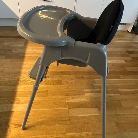 høy barnestol egnet for barn. Stolen har en høy konstruksjon som gir god sitteposisjon ved bordet. Designet for å gi støtte og komfort under måltider.