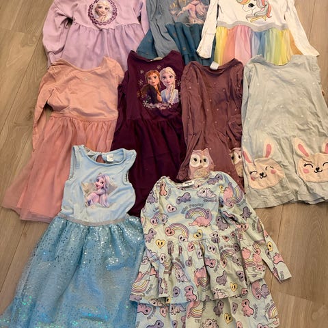 Tøypakke til 4 åring jente (størrelse110) med råkul jakke og flotte kjoler