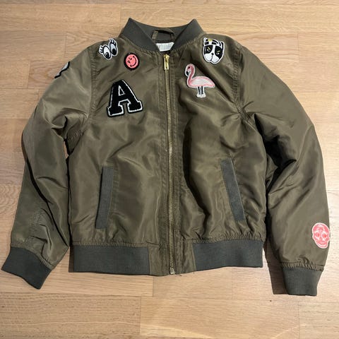 H&M jakke i størrelse 128/134, laget av bomull. Jakken er grønn og med detaljer som broderte stjerner og påsydde merker. Den har knappelukking og glidelås, samt lommer foran.